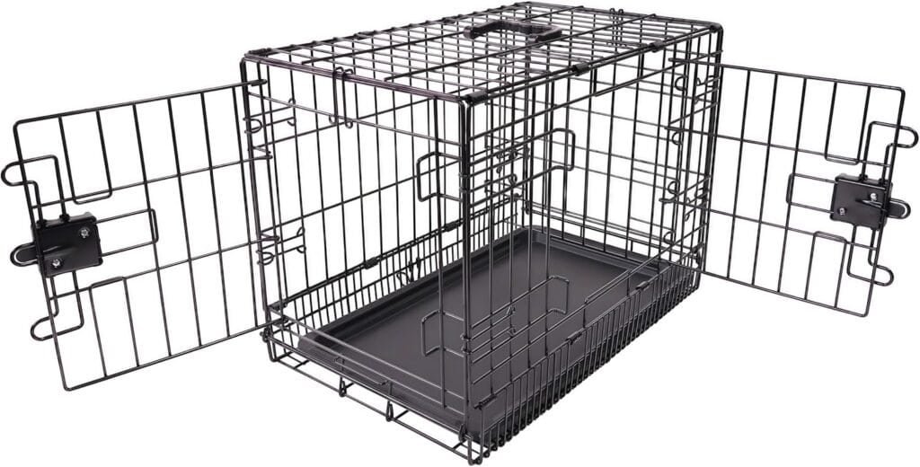 I recommend the 30″ Amazon Basics Double-Door Folding Metal Dog Crate. It has a removable partition that divides the crate for use with your puppy when your first bring him or her home. Once puppy grows the partition can be removed.